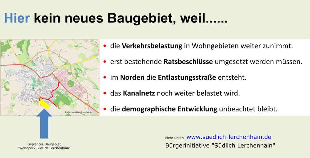 Um unsere Ziele und Argumente gegen den sogenannten "Wohnpark Südlich Lerchenhain" einer breiteren Öffentlichkeit darzustellen, wurde am Ortseingang Dülmener Straße das folgende Plakat aufgestellt.